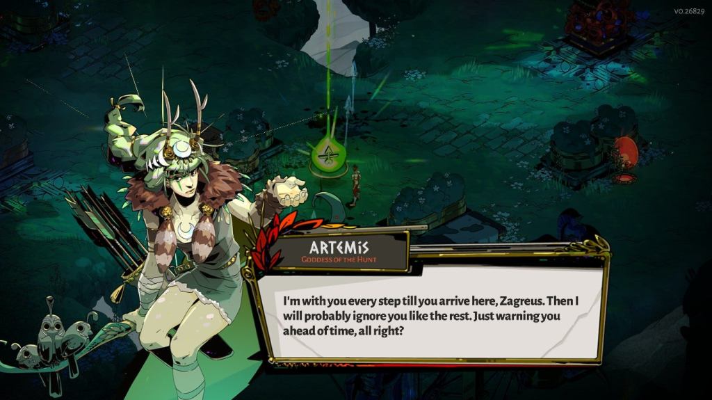 As Zagreus, the Prince of the Underworld, you’re tasked with two responsibilities: maintaining your family’s household, and trying to escape to the surface. After learning the truth about his birth, Zagreus makes it his mission to break out from the Underworld to find his birth mother, living somewhere in Greece. The only thing that’s stopping him are the armies of the dead, waiting to send him home. Assisting him are the Gods of Olympus, who believe Zagreus is trying to flee to their haven. You’ll hear from Athena, Poseidon, Aphrodite, and Hermes, just to name a few. Also along the way, Zagreus builds bonds with the many servants of his palace and denizens of the Underworld. It’s hard to whittle down the cast to determine my favorites, but ones that particularly stood out to me were Achilles, Megaera, Sisyphus, Dusa, Eurydice, and Skelly.