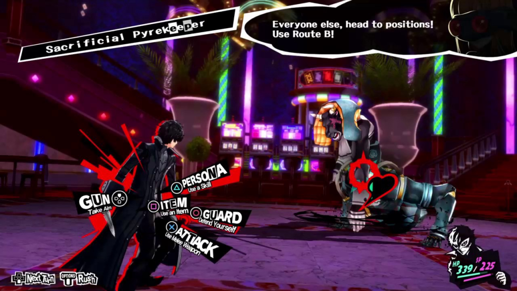 One of the main reasons I love this game is how it expresses and presents itself. P5 just oozes style, with its comic/pop-art aesthetic, regular use of red, white, and black, and text styled after clippings in a ransom note. It appears to be heavily influenced by the British punk scene of the 1970s and 1980s, with a thematically-appropriate “never back down to authority” attitude pervading throughout. Contrasting that is the soundtrack, which brings an element of jazz new to the franchise. Each song is unique and memorable, helping to build the mood of whatever it is you happen to be doing. I found myself regularly singing along with the songs, whether humming “Beneath the Mask” while wandering Shibuya’s streets at night, or belting out “The Whims of Fate” exploring the distorted casino. By far, however, my favorite part of the entire game’s presentation is the animation that displays whenever you defeat enemy Shadows. The Victory Screen is integral to any JRPG, as fans of the Final Fantasy franchise can attest. Instead of describing it to you, however, just take a look and see what I mean.