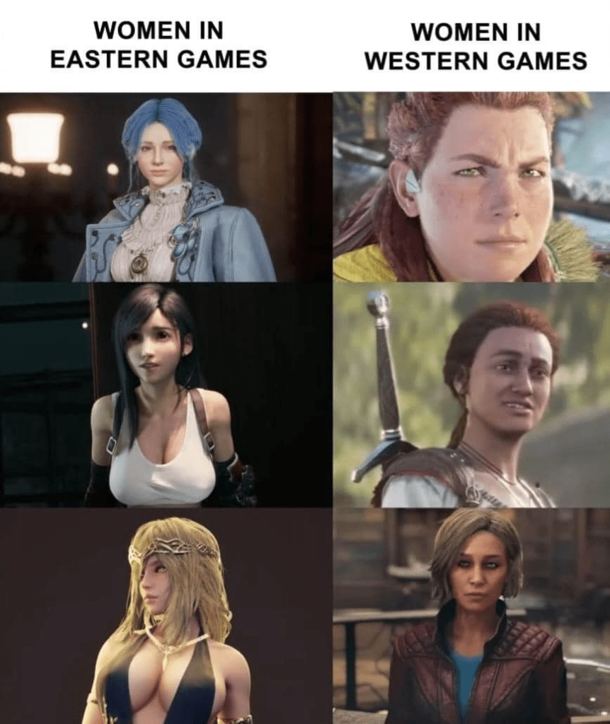 A cross-section of the western gamer population has, over the last few years, began to decry the “uglification” of video game characters. Blaming the trend on “woke culture” and “DEI practices,” there are many who believe western game developers are purposefully making female characters unpleasant to look at, as some GameFAQs users write, “so that they can be empowered with confidence, so that ugly people dont think they are left out in society”, or that “Japanese dont care about what SJW or feminist groups have to say”. They create a contrast between western developers’ character designs (Mary Jane Watson, Kay Vess, Abby Anderson, etc.) versus eastern developers’ (Tifa Lockheart, Mai Shiranui, Jill Valentine, etc.). Instead of a conversation about the objective qualities of the game, the world has been focused more on the character’s appearance than her abilities. I’m not going to pretend to try to get into the minds of game developers and why one design is chosen over another. Weren’t we taught to judge books by their covers, that beauty is only skin-deep (or polygon-deep, in this case)? Beyond just the observance of women’s bodies, some of these squabbles are filled with ignorance, like not knowing women can also have peach fuzz; or outright creepiness, like toward a character’s juvenile design; the meme below alone proves my point. Sure, I enjoy looking at beautiful women as much as anyone else, but that won’t determine whether or not I play a game. There’s nothing wrong with enjoying the artful nature of the female form, but there’s also nothing wrong with just wanting to play a game.