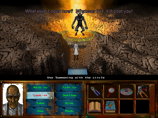 Anyone who’s familiar with Space Quest or The Secret of Monkey Island will instantly recognize I Have No Mouth as a point-and-click adventure. Picking up objects, using them on the characters and the environment in various fashions to solve puzzles, and exhausting every option of dialogue with all the NPCs was a staple of computer games in that era. Sometimes, the combination of verbs and items may make little-to-no sense, such as hiding a jar of eyes in a cardboard box or wearing a blindfold to defeat a Sphinx, which was also typical of the time. It requires out-of-the-box creativity, a willingness to try anything and everything to determine the solution. A mechanic that made this game unique for its time was the inclusion of the spiritual barometer, essentially a little meter that measures morality. Good, positive actions will increase the meter, and evil, immoral actions decrease it. This is meant to act as a “health” system in the final segment of the game, where you defeat AM. The higher your spiritual barometer, the more trial-and-error puzzle solving you can perform. This mechanic is likely meant to reinforce Ellison’s belief of goodness in the face of calamity, that, through your actions, you can overcome a great deal more than you realize.